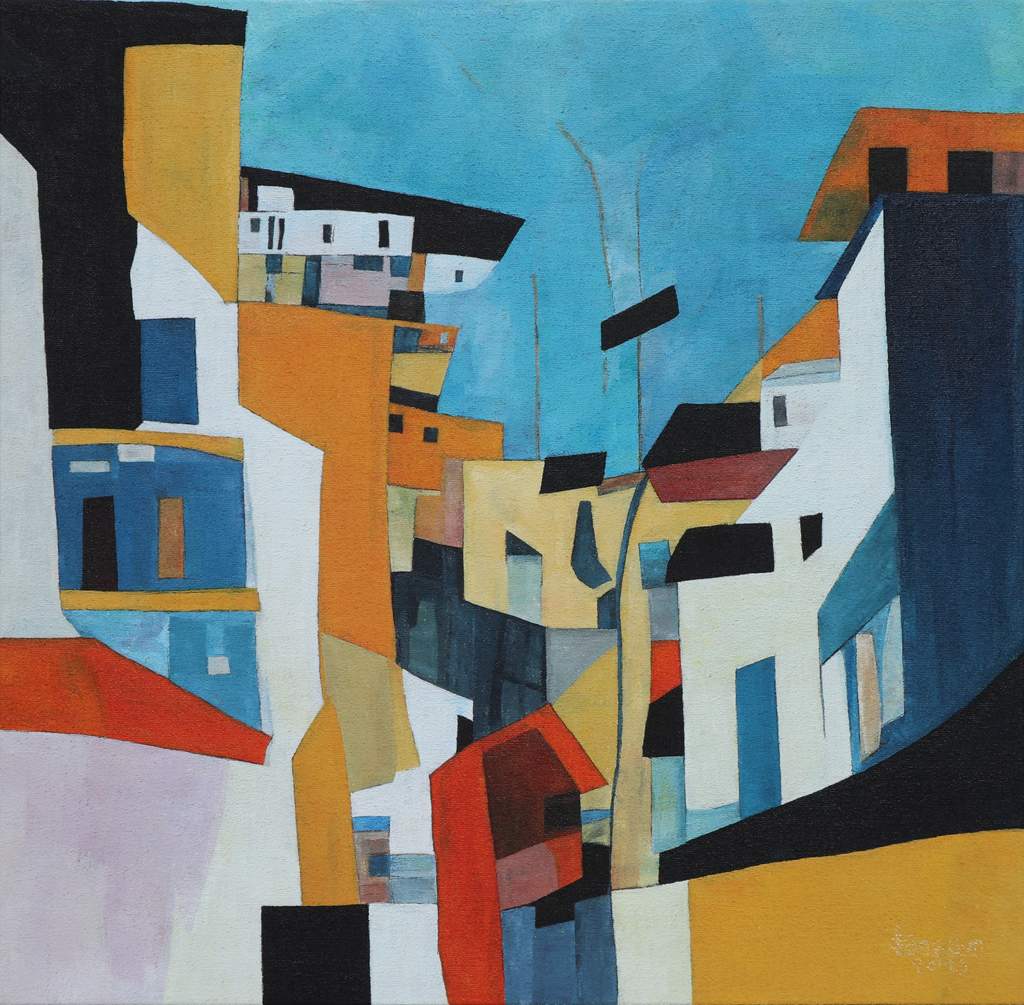 이상선 작가는 톡톡 튀는 색과 구도로 문득 낯설어진 익숙한 풍경을 재구성합니다. 먼저 노랑, 빨강과 흰색으로 풍경들을 표현하면 화면 위 색들이 제각각 튀는 개성을 발휘하고 그 위에 파랑, 녹색과 검정을 더하면 서로 견제하고 어울려 더욱 조화로움을 발산합니다. 직선을 추구하지만 어느새 선은 이리저리 자유롭게 구부러지고 꺾여있습니다.