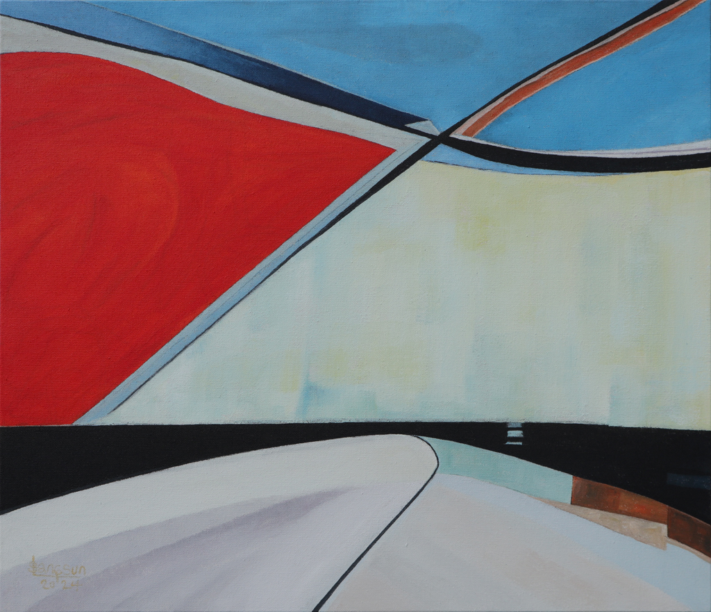 Lee Sangsun reconstructs familiar landscapes that suddenly feel unfamiliar, using vivid colors and dynamic compositions. Beginning with yellow, red, and white, each hue asserts its presence, sparkling with individuality. When layered with blue, green, and black, they temper and balance each other, creating heightened harmony. Though she begins with straight lines, the marks soon bend, twist, and wander freely across the canvas.