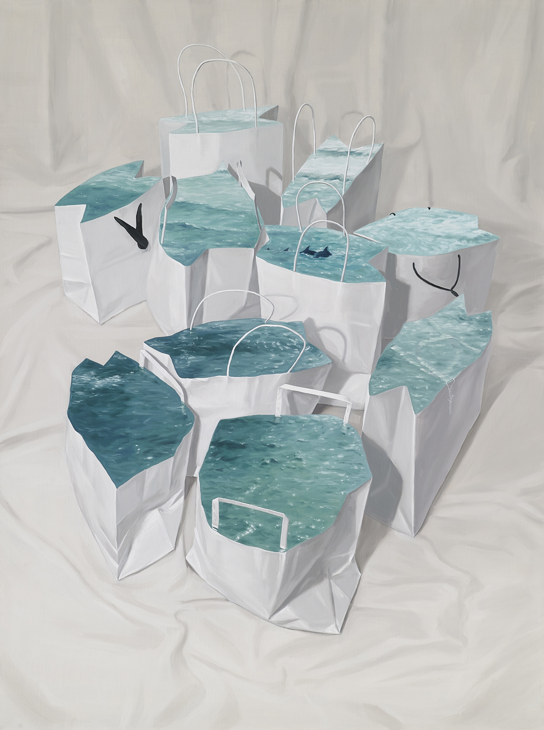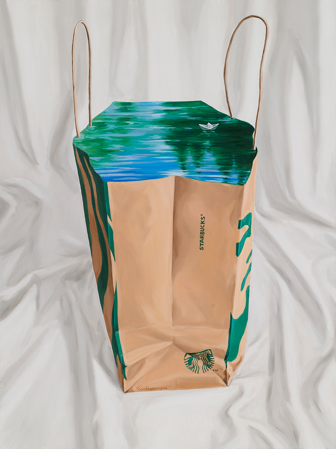 Yoon Soyun captures the sea and sky on paper bags and boxes, offering scenes that appear still yet never cease to move. She fills these humble surfaces with shifting waters and vast skies, as if pouring them generously into each work. Paper boats and airplanes evoke childhood wonder, stirring a longing to drift toward wider horizons. While gazing at her seas, skies, and forests, perhaps you, too, may build a quiet, peaceful sanctuary of your own.